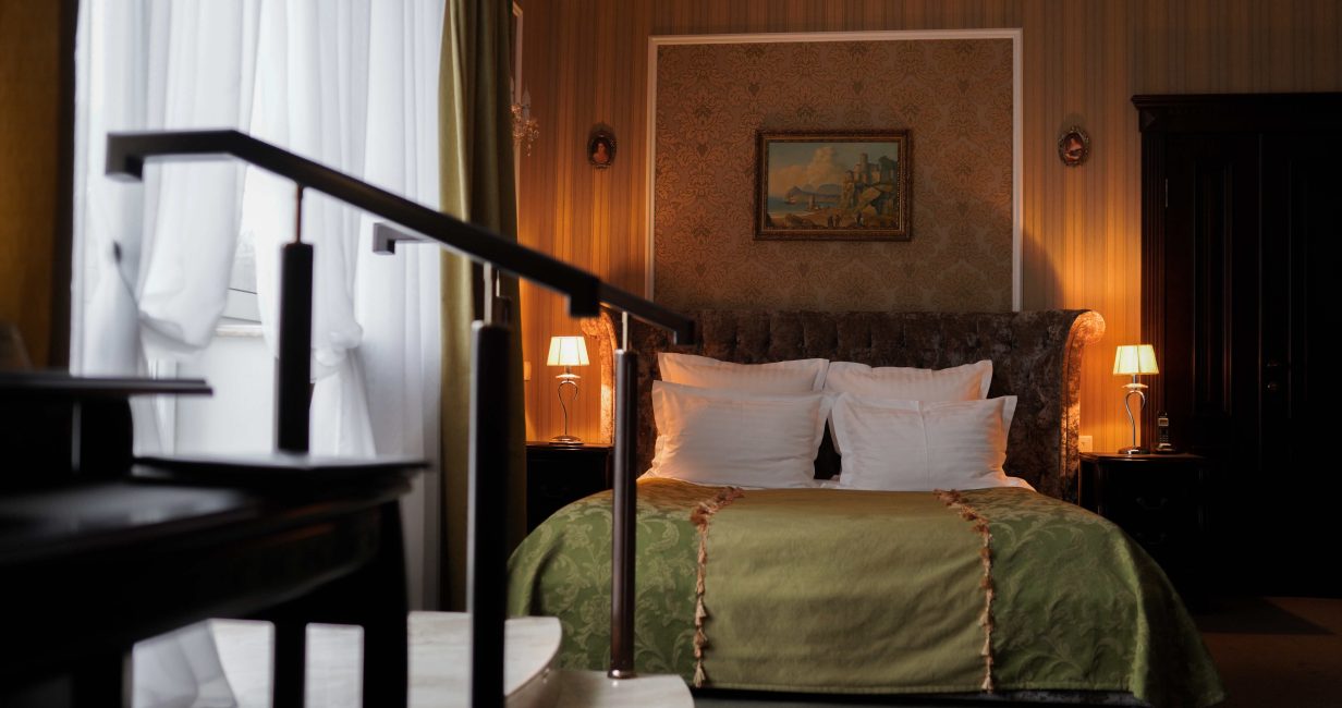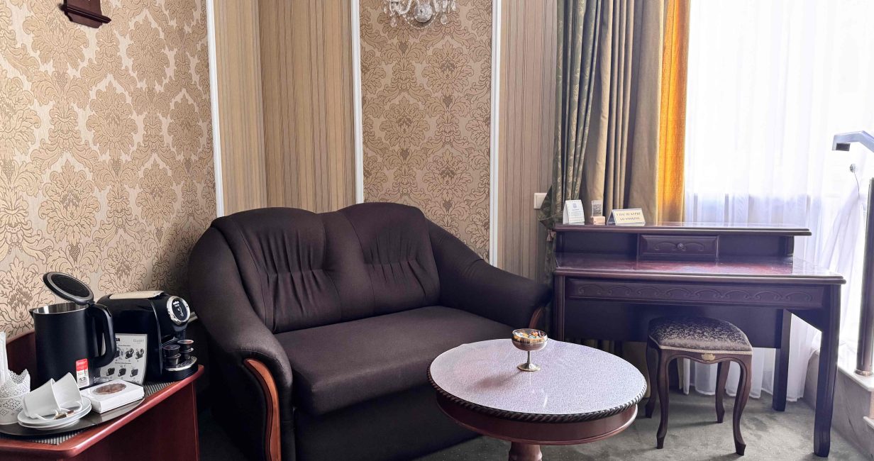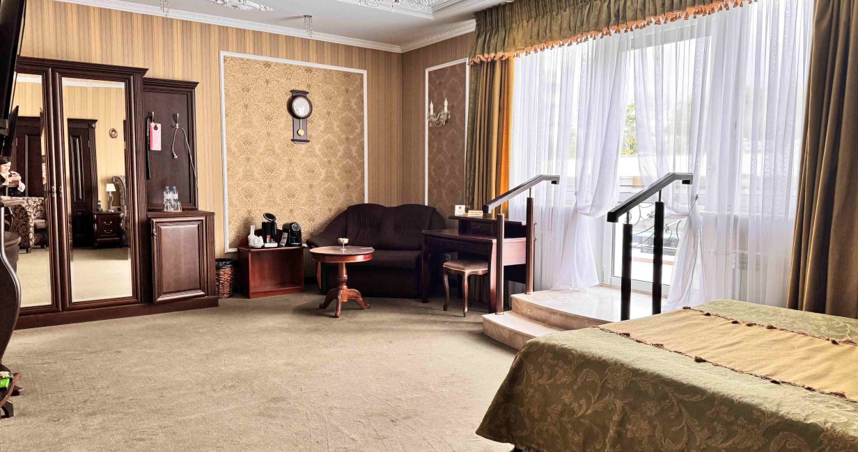 This spacious one-room suite of 35 m² is designed for those who appreciate sophisticated surroundings and a high level of comfort. The modern designer interior, cozy relaxation area with soft furniture, and King Size bed create an atmosphere of absolute comfort. The panoramic half-stained glass windows or private veranda fill the space with natural light and offer a magnificent view of the park. Here, you’ll enjoy working, relaxing, and savoring the moment.